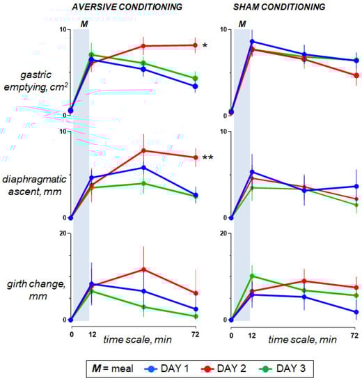 Digestive response to meal ingestion. On day 2, duodenal lipid infusion in the test group was associated with a sustained increase in antral cross-sectional area (delayed gastric emptying; * p < 0.001) and diaphragmatic ascent (prolonged abdominal accommodation; ** p = 0.002); effects measured as the changes in the area under the curve on day 2 minus day 1 vs. sham infusion. However, data for day 3 show that aversive conditioning in the test group (previous exposure to the aversive stimulus) did not induce significant effects. Values represent mean ± SE.
