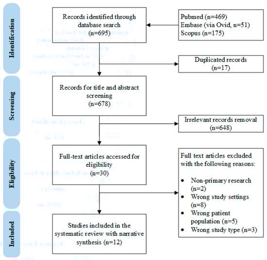 The complete study selection process is shown in the PRISMA diagram in Figure 1. Briefly, 695 records were identified through PubMed, Embase (vid Ovid) and Scopus databases. A total of 678 records underwent title and abstract screening after duplicates were removed. A total of 30 records were considered for full-text screening, and 18 were excluded for the following reasons: non-primary research (n = 2) [14,15], wrong patient population (n = 5, where the studies focused on neonates with physiological jaundice or with congenital anomalies) [16,17,18,19,20], wrong study type (n = 3, either case report or in vitro/animal studies) [21,22,23], and wrong study design (n = 8, assessed wrong exposure, incorrect comparison groups or lack of formal comparison) [24,25,26,27,28,29,30,31].