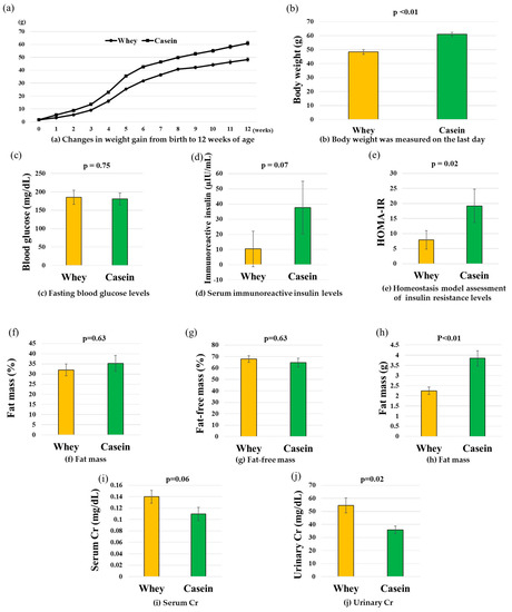 Body weight and glucose metabolism markers. (a) Changes in weight gain from birth to 12 weeks of age (●: Whey, ■: Casein). (b) Body weight was measured on the last day. (c) Fasting blood glucose levels. (d) Serum immunoreactive insulin levels. (e) Homeostasis model assessment of insulin resistance levels. (f) Fat mass (%). (g) Fat-free mass (%). (h) Fat mass (g). (i) Serum Cr. (j) Urinary Cr. Data are shown as the mean ± standard error of the mean (n = 6 per group).