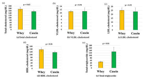For cholesterol levels, no significant differences in total or individual values were observed between the two groups (total: 173.51 mg/dL vs. 153.46 mg/dL, p = 0.63; VLDL: 10.85 mg/dL vs. 10.94 mg/dL, p = 0.94; LDL: 25.16 mg/dL vs. 23.38 mg/dL, p = 0.52; HDL: 136.44 mg/dL vs. 116.16 mg/dL, p = 0.26) (Figure 3a–d). In contrast, triglyceride levels were significantly lower in the whey group than in the casein group for every outcome measured (total: 51.47 mg/dL vs. 119.2 mg/dL, p = 0.01) (Figure 3e).
