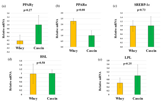 RT-qPCR analysis showed that the hepatic expression of PPARα was marginally higher in the whey than in the casein group (p = 0.08); however, no other differences were observed for any of the other lipid metabolism-related genes evaluated (PPARγ, p = 0.27; SREBP1c, p = 0.73; HSL, p = 0.58; LPL: p = 0.25) (Figure 4a–e).