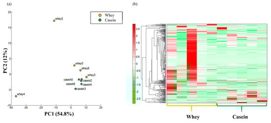 Compared to soy protein, whey protein has been reported to decrease the circulating levels of interleukin-6 and tumor necrosis factor-α and affect muscle metabolism [35]. In our study, whey protein was found to increase the level of the anti-inflammatory marker 1-methylnicotinamide in adipose tissue compared to casein protein. Greater muscle mass due to elevated serum creatine can reduce myogenic insulin resistance [36]. In this study, we did not measure muscle mass, and the two groups analyzed had statistically similar body compositions. From these results, whey protein may have the potential to reduce visceral fat more than subcutaneous fat. One possible reason why no difference was observed in FFM could be due to the relatively short duration of the intervention period for both whey and casein protein diets. However, we determined that serum creatine was significantly higher in the whey group than in the casein group. Whey protein is commonly used as a dietary supplement to increase muscle mass [37] along with increasing creatine; thus, whey protein may have influenced creatinine in this study. Elevated levels of serum creatine caused by whey protein intake may improve insulin resistance.