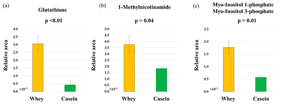 Comprehensive comparative analysis between the whey and casein groups. (a) Glutathione. (b) 1-Methylnicotinamide. (c) Myo-Inositol 1-phosphate and Myo-Inositol 3-phosphate (n = 5 per group).