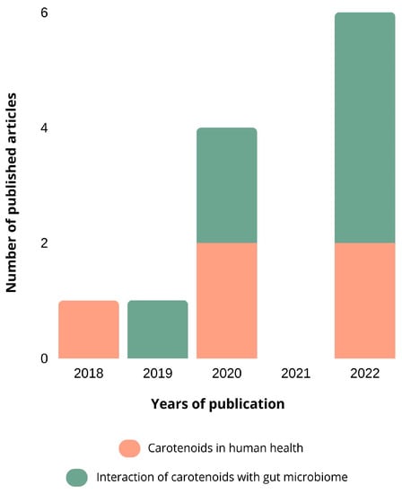 The number of published articles related to carotenoids and their interaction with the intestinal microbiota, according to its year of publication, is represented in Figure 2.