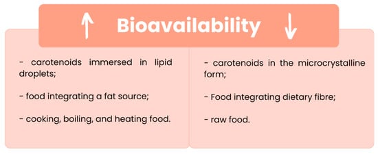 The principal factors affecting the carotenoids’ bioavailability, enhancing (left) or decreasing (right) it, are represented below, in Figure 3.