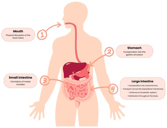 The carotenoid absorption mechanism can be divided into release from the food matrix, transfer to the oil phase, formation of mixed micelles, and absorption, as represented below, in Figure 5.