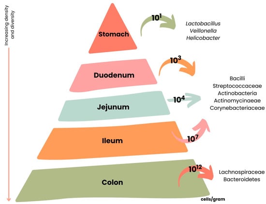 The intestinal microbiota composition is different along the GIT []. The stomach and small digestive tract are colonized by only a few species of bacteria, and in the colon are present approximately 1012 bacterial cells/g of gut content []. Almost 99% of the bacteria that colonize the intestine are anaerobes, but in the connection between the small intestine and the colon (cecum), a high density of aerobic microorganisms can be found [].
