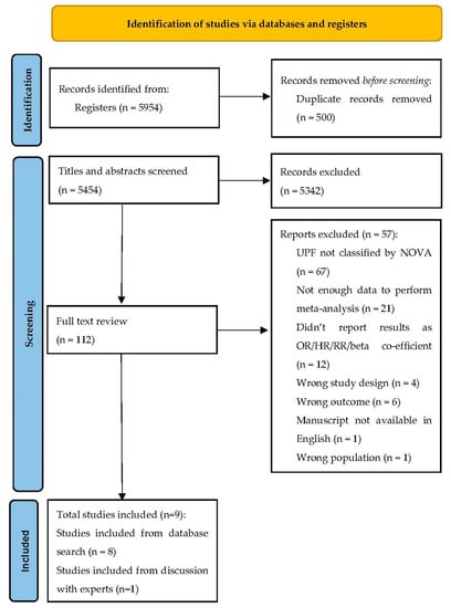 A flowchart demonstrating the selection process of the studies is illustrated in (Figure 1). After duplicates were excluded (n = 500), 5454 records were identified and 8 met inclusion criteria and were subsequently included in the current study. A further single article, not previously identified via systematic literature search, met the inclusion criteria following discussion with an expert in the field. In total, 60,961 participants were analysed. In full text review, most studies were excluded due to not classifying UPF via the NOVA classification system (whether NOVA was referenced directly or not) (n = 67) or lacking sufficient data to perform meta-analysis (n = 21).