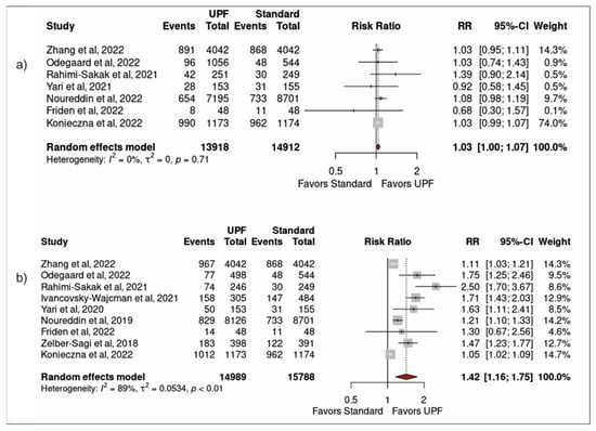 Forest plots from a random-effects model portraying the association between (a) moderate (vs. low) ultra-processed food intake and development of NAFLD; (b) high ultra-processed food intake and development of NAFLD [,,,,,,,,].