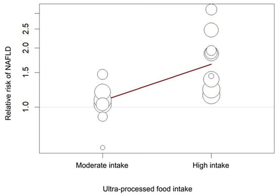 Moderate intake of UPFs was associated with increased risk of developing NAFLD (pooled RR 1.03 (1.00–1.07) (p = 0.04)), with low heterogeneity (I2 = 0% (p = 0.71)). Neither the study by Ivancovsky-Wajcman et al. nor the study by Zelber-Sagi et al. included data for moderate intake of UPFs and they were therefore excluded from this meta-analysis [,] (Figure 2a). High intake of UPFs was associated with increased risk of developing NAFLD (1.42 (1.16–1.75) (<0.01)), with significant heterogeneity (89% (<0.01)) (Figure 2b). A bubble plot was used to visually represent the dose–response effect between UPF intake and NAFLD following meta-regression analysis (Figure 3).