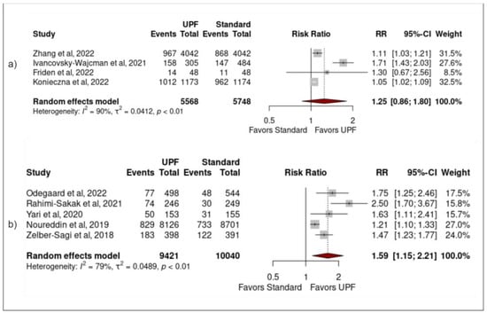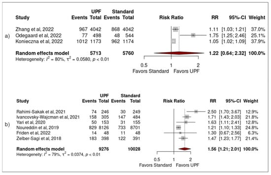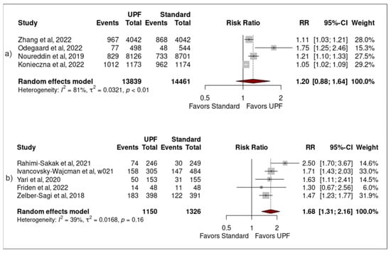 Forest plots demonstrating the association between high UPF intake and NAFLD when studies (a) were longitudinally designed, (b) were not longitudinally designed [,,,,,,,,].