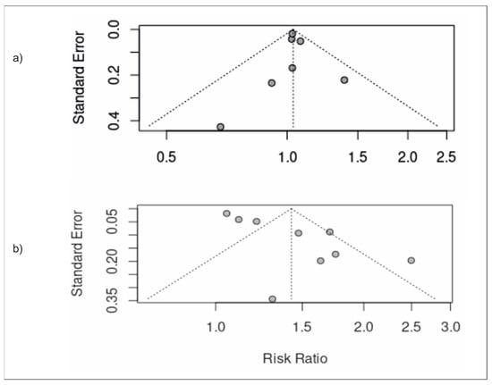 Funnel plots portraying risk of publication bias for studies assessing the association between (a) moderate ultra-processed food intake and development of NAFLD; (b) high ultra-processed food intake and development of NAFLD.