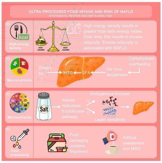 Graphical discussion. NAFLD = non-alcoholic fatty liver disease; IHTG = intra-hepatic triglyceride deposition; SFA = saturated fatty acids; MSG = monosodium glutamate. (a) ultra-processed foods are highly energy dense, contributing towards excess visceral adiposity and fatty liver disease; (b) ultra-processed foods are high in dietary saturated fat and refined carbohydrates which promote de novo lipogenesis and consequent intra-hepatic triglyceride deposition if consumed in excess, chronically; (c) ultra-processed foods are high in sodium salt which activates the aldose reductase-fructokinase pathway. This in turns upregulates endogenous fructose availability and downregulates leptin sensitivity, increasing hepatic adiposity; (d) ultra-processed foods are often saturated with artificial food processing ingredients in their food matrix, such as artificial sweeteners and mono-sodium glutamate, and packaging, often in the form of bisphenol a.