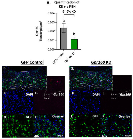 The viral knockdown strategy used generates substantial DVC GPR-160 KD as validated via fluorescent in-situ hybridization. (A) Fluorescent in-situ hybridization (FISH) was performed on DVC sections of all rats included in the behavioral study (AAV-GFP control n = 8; AAV- Gpr160 KD n = 10) and the amount of Gpr160 transcript per unit area was calculated. Data are expressed as ±SEM and analyzed with unpaired t-test. Significant differences between means are denoted by different letters (p < 0.05). (B–F) Representative DVC images of an AAV-GFP control treated animal following FISH. Scale bar 100 µm. (G–K) Representative DVC images of an AAV- Gpr160 KD treated animal following FISH.