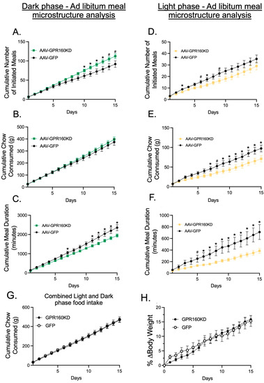 DVC Gpr160 KD causes changes in dark and light phase meal microstructure without affecting total 24 h feeding. Rats (AAV-GFP control n = 8; AAV- Gpr160 KD n = 10) were housed in BioDAQ cages equipped with the Episodic Intake Monitor and continuous recording of the meals taken by each animal were collected for 15 days starting two weeks after delivering the virus into the DVC. Data was split into light and dark phase to evaluate changes in meal microstructure. (A,D) DVC Gpr160 KD produces an increase in the number of initiated meals during the dark phase and a slight decrease in the light phase. (B,E) DVC Gpr160 KD reduces total light phase feeding without affecting total feeding during the dark phase. (C,F) DVC Gpr160 KD reduces the time spent during a meal in both the light and dark phases. (G) Gpr160 KD does not alter total food intake throughout a 24 h period. (H) Gpr160 KD animals show no difference in body weight acquisition when compared to GFP treated controls. Data were analyzed using independent t-tests for each day and are expressed as ±SEM. (* = p < 0.05; # = p < 0.06).