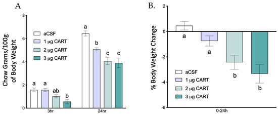 To identify an effective 4th ventricular dose, a cohort of rats (n = 9) received a 4th ICV injection of three different doses of CART (1, 2 or 3 μg/μL) just before lights out. Food intake was then measured at an early (3 h) and late (24 h) timepoint, and 24 h change in body weight was collected. Injection of CART into the 4th ICV dose dependently decreased food intake and body weight (Figure 4A,B). However, high doses of CART delivered intracerebroventricularly have been reported to produce seizure-like events in rats [12,35]. Consistent with this, the 3 μg/μL dose tested here also produced tremors and seizure-like events. Therefore, further experiments were performed using a 2 μg/μL CART dose since it did not cause such side effects.