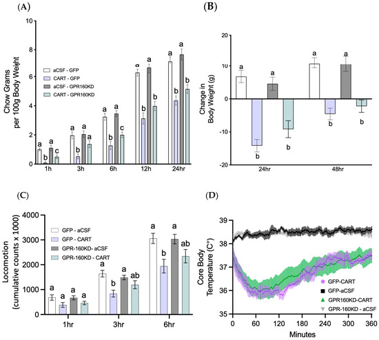 DVC Gpr160 KD attenuates 4th icv CART mediated anorexigenic, but not locomotor or core body temperature effects. (A,B) Rats (AAV1-GFP control n = 8; AAV- Gpr160 KD n = 10) were administered 4th icv CART at the onset of the dark cycle and food intake and BW was assessed at the following timepoints 1-, 3-, 6-, 12- and 24-h. (C,D) During this time, physiological effects such as locomotion and core body temperature changes were also measured. Data are expressed as ±SEM and analyzed using 2-way ANOVA followed by Student–Newman–Keuls post hoc test. Significant differences between means are denoted by different letters (p < 0.05).