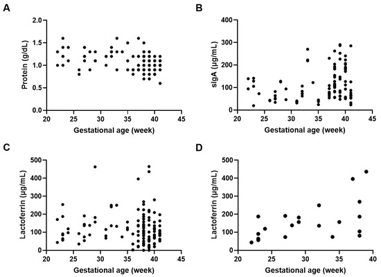 Various factors could affect the protein and immune component levels in DHM. We determined the effect of gestational age on protein and immune component levels and found that protein levels were negatively correlated with gestational age (p < 0.001; r = −0.334) when all postpartum weeks were analyzed simultaneously (Figure 1A). For immune components, simultaneous analysis of all postpartum weeks revealed a positive correlation between sIgA levels and gestational age (p < 0.05; r = 0.206) (Figure 1B), whereas no correlation was found between lactoferrin levels and gestational age (Figure 1C). However, a positive correlation was seen between gestational age and lactoferrin levels in DHM collected between 0 and 8 weeks postpartum (p < 0.05; r = 0.531) (Figure 1D).