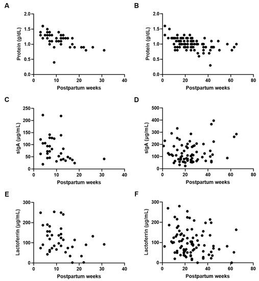 Protein and immune component concentrations in relation to postpartum week. Correlation between postpartum week and (A) protein levels in preterm DHM (r = −0.672, p < 0.001), (B) protein levels in term DHM (r = −0.495, p < 0.001), (C) sIgA levels in preterm DHM (r = −0.400, p < 0.05), (D) sIgA levels in term DHM (r = 0.055, p = 0.644), (E) lactoferrin levels in preterm DHM (r = −0.322, p < 0.05), and (F) lactoferrin levels in term DHM (r = −0.200, p = 0.063).