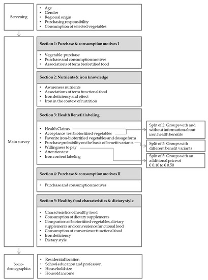 Therefore, the aim of the present study was to examine the acceptance of German consumers towards iron-biofortified vegetables. The consumer survey conducted for this purpose addresses two main topic areas: