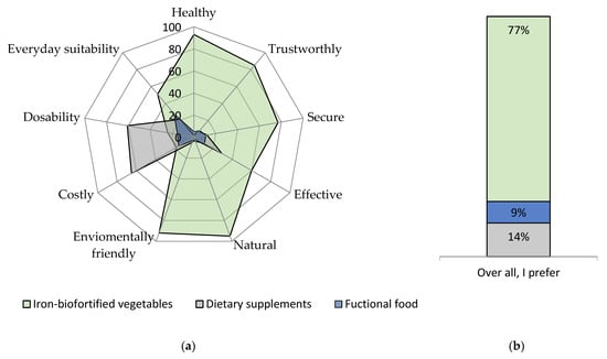 Consumer evaluation of iron-biofortified vegetables, iron-fortified functional foods, and iron-containing dietary supplements based on various criteria (a) and a comparison of preferences as a whole (b). Results refer to Q39 of the questionnaire, see Supplementary Materials. n = 1000.