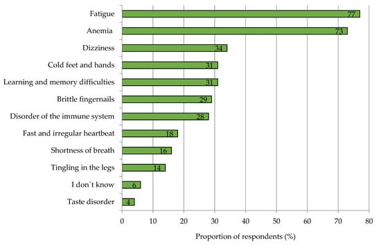 Among the German consumers surveyed, vitamin C proved to be the best-known nutrient, with a level of awareness of 96%. Iron was known by 92% of the respondents, and iodine followed in third place with 87% (Appendix A, Figure A1). With regard to the health effect of iron on the human organism, four out of five participants stated that iron had a positive effect. Only 15% were unsure, and 1% assessed the effect as rather negative. Along with the high level of awareness, over 70% of participants correctly stated that fatigue and anemia were among the symptoms of iron deficiency (Figure 3). Other symptoms of iron deficiency were significantly less known. Only about two out of six could attribute the symptoms of dizziness, cold feet and hands, learning and memory difficulties, brittle fingernails, and immune system disorders to iron deficiency.