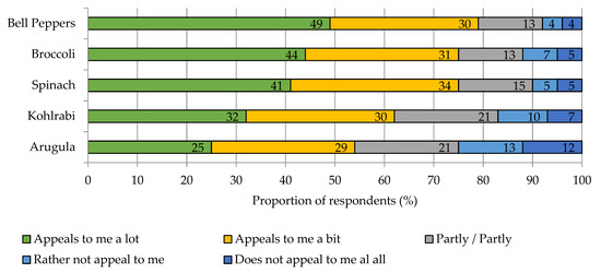 Fresh, iron-rich vegetables might be particularly appealing to people following a vegetarian or vegan diet. Women, who often consume more vegetables than men, are also likely to be attracted by such products [42]. In addition, consumers interested in a natural, healthy diet could be considered as a target group. Previous surveys in Europe on biofortified vegetables and fruits have shown that between 48 and 66% of the population are open-minded towards such products, especially those consumers who also value sustainability and naturalness [43,44,45]. At the same time, however, there is a high lack of knowledge about these products, which affects the purchase probability [43]. The aforementioned studies focused on fresh biofortified food with iodine, selenium, and lycopene. So far, very little information is available on consumer acceptance of iron-biofortified vegetables in Europe and other developed regions of the world. The situation is different for developing countries, where several biofortified products such as iron-rich beans and pearl millet are already widely used to combat hidden hunger [46,47,48,49]. However, the findings obtained there in accompanying consumer surveys cannot be transferred to the realities in industrialized countries because of the more serious malnutrition, the fundamentally different socio-economic conditions, and the divergent marketing channels for foodstuffs.