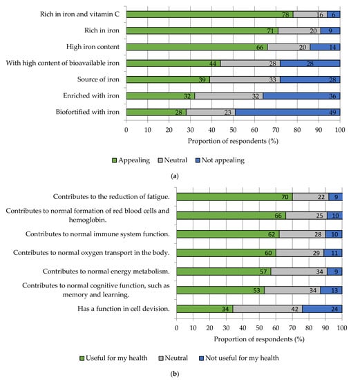 Attractiveness of nutrition claims (a) and health claims (b) for iron-rich vegetables in the purchase decision for iron-rich vegetables. Results refer to Q23, Q26, and Q35 of the questionnaire, see Supplementary Materials. n = 1000.