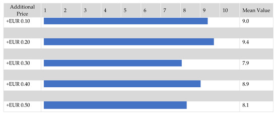 Respondents who indicated a high likelihood of purchasing iron-biofortified vegetables (21.8% of the sample) also expressed a willingness to pay a premium price. Across all five exemplary iron-biofortified vegetables (bell pepper, broccoli, spinach, arugula, and kohlrabi), an additional willingness to pay of EUR 0.10 to EUR 0.20 was found (mean value ≥9.0 on a 10-point scale, Figure 8). For a 250 g bag of spinach, this corresponded to an additional willingness to pay of 5.6–11.2%. For a 125 g bag of arugula, it was 11.2–22.5%; for a head of broccoli, 8.4–16.8%; for a set of 3 bell peppers, 9.2–18.4%; and for a kohlrabi, 20.4–40.8% (product images in Supplementary Material, Q33). At a premium of EUR 0.30, the purchase probability decreased. Nevertheless, the purchase probability still ranged from 7.3 to 8.9 at an additional price of EUR 0.30 to EUR 0.50.