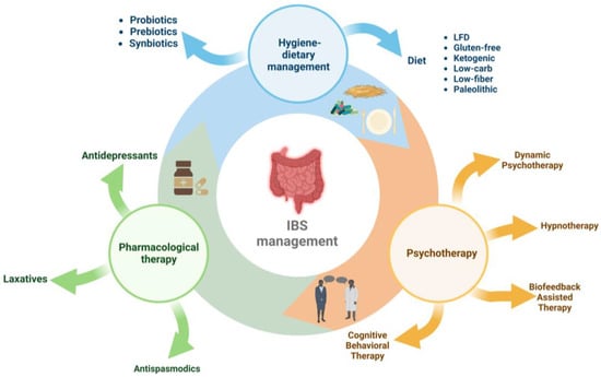 Management of IBS includes three directions (Figure 1): pharmacological therapy (antidepressants, antispasmodics, and laxatives), interventions on hygienic-dietary revitalisation [41,42,43], and psychotherapy (cognitive behavioural psychotherapy, dynamic psychotherapy, hypnotherapy, and biofeedback-assisted stress management intervention) [10,26,44].