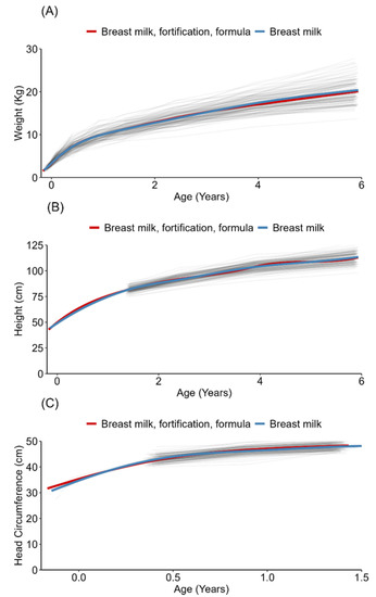 Growth in the two feeding groups from birth up to 6 years of age (A) weight gain (grams); (B) height (centimeters); (C) head circumference (centimeters) up to 1.5 years of age.
