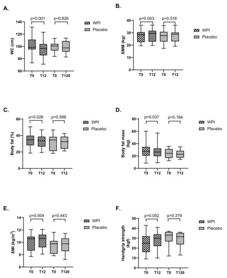 After 12 weeks of WPI supplementation, waist circumference, fat mass, and % fat mass decreased, while skeletal muscle mass and skeletal muscle index increased when compared to placebo (Figure 2). Handgrip strength showed a tendency towards increase (mean 25.7 kgf before and 28.1 kgf after WPI supplementation, p = 0.05). Of note, among patients who received the placebo, no significant change was observed. No changes were observed in body mass index for WPI supplementation and placebo when comparing the baseline and final results of the study.