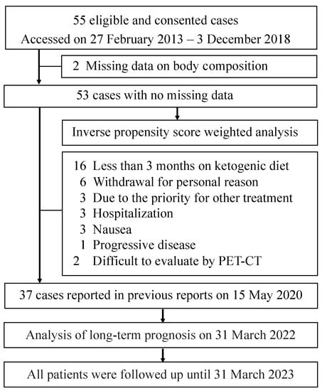 In the previous report, 55 patients met the entry criteria and were enrolled in the trial. Of these, 37 patients who had been on a ketogenic diet for at least three months and had imaging results to assess malignant tumor progression were included in the analysis. All 55 cases were followed for outcome. Two patients dropped out due to deteriorating physical condition immediately after consent was obtained, and data on their body composition were missing. Therefore, only 53 patients were available for analysis (Figure 1).