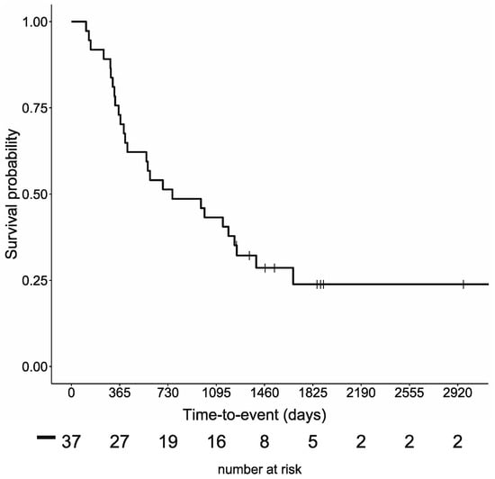 The survival curves for the previously reported 37 cases are shown in Figure 2. For these 37 cases, the mean age at the beginning of the study was 54.8 ± 12.6 years, and the median follow-up period was 25 (range of 3–104) months. Twenty-eight patients died during the follow-up period, with a median OS of 25.1 months and a 5-year survival rate of 23.9%. For patients with colorectal cancer, eight patients remained on the ketogenic diet for more than three months. The mean age at the beginning was 49.3 ± 13.7 years, and the median follow-up period was 19 (10–62) months. The median duration of the ketogenic diet was 11.5 (4–48) months. Six patients died during the follow-up period, and the median OS was 19 months (Figure S1). For patients with lung cancer, six patients remained on the ketogenic diet for more than three months. The mean age at the beginning was 56.7 ± 5.5 years, and the median follow-up period was 41.5 (9–104) months. The median duration of the ketogenic diet was 16.5 (3–99) months. Four patients died during the follow-up period, and the median OS was 33.1 months (Figure S2).