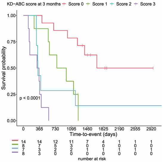 KD-ABC scores significantly stratify cumulative survival rates (p < 0.0001, log-rank test).