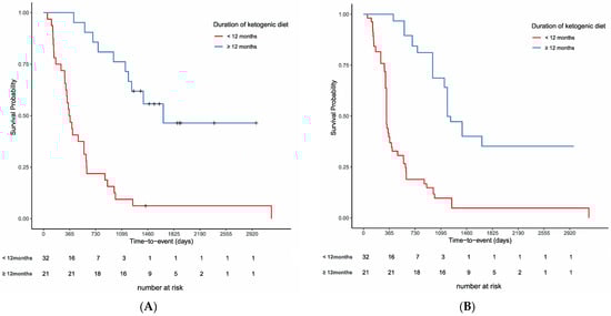 Overall survival rates for the 37 cases. (A) Unadjusted comparison of patients who had been on a ketone diet for more than 12 months and those who had not (p < 0.001, log-rank test). (B) Comparison of the two groups on the inverse propensity score-weighted analysis (p < 0.001, adjusted log-rank test).