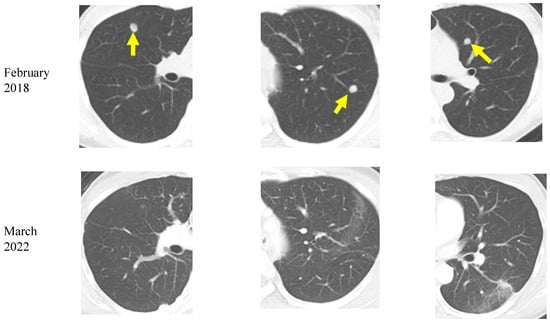 Chest computed tomography images of a colorectal cancer patient with lung metastases (yellow arrows). A decrease in bilateral multiple lung metastases 4 years after the start of the ketogenic diet is seen.