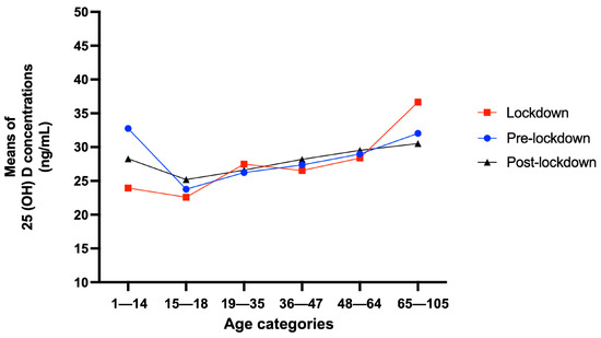 As presented in Figure 1, the youngest population, aged between 1 and 14, was affected by the strict lockdown measures; this is reflected in the insufficient status of 25 (OH) D observed in the lockdown and post-lockdown periods: 23.9 ng/mL and 28.2 ng/mL, respectively. Intriguingly, the older population (65-105) was less likely to be affected by these strict directives, and all means of 25 (OH) D concentrations for this category were above 30 ng/mL during all periods, indicating sufficient levels.