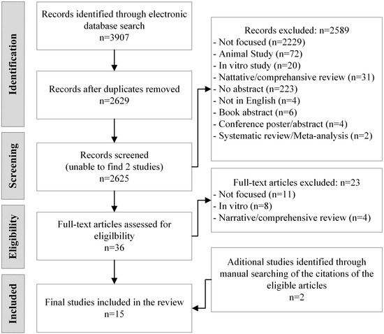 The initial search identified 3907 articles and, after eliminating duplicate articles and articles that could not be retrieved, 2627 remained. After reviewing titles and abstracts, 36 full-text articles were reviewed and 15 met the review criteria (Figure 1). Among the 15 studies, 11 were case–control, 3 were cohort studies and 1 was a clinical trial. Table 3 provides a detailed description of the articles and summarizes the results of the individual sources of evidence.
