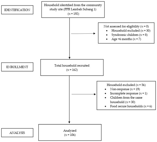 Initially, 192 households were screened and assessed for study eligibility during the early recruitment phase. Of these, 30 households were excluded due to the child’s chronic illness (n = 15) and clinical syndrome (n = 8). A further seven households with children less than 6 months old were removed. In total, 162 households were successfully enrolled on recruitment; however, an additional 56 households were omitted from the study due to non-response (n = 19), incomplete questionnaire response (n = 1), food secure household (n = 6), and children from the same household (n = 30). In the end, only 106 households were included in the data analysis. The progress of each phase of this study is summarized in Figure 1 below.