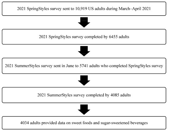 As described in Figure 1, the SummerStyles survey was sent to persons who participated in the SpringStyles survey (an initial wave). The survey respondents received cash-equivalent reward points for their participation (worth approximately $10). From March to April 2021, the SpringStyles survey was sent to 10,919 panelists (≥18 years), and 6455 completed the survey, a response rate of 59.1%. During June 2021, the SummerStyles survey was sent to 5741 adults who completed the SpringStyles survey. The SummerStyles survey was completed by 4085 adults (≥18 years), a response rate of 71.2%. The data were weighted to match the 2019 Census’ American Community Survey proportions using 9 factors: age, sex, race/ethnicity, education, household income, household size, census region, metropolitan status, and parental status of children aged 12–17 years old. Of 4085 adults who completed the 2021 SummerStyles Survey, 51 adults (1.2%) with missing data on outcome variables (i.e., intake of sweet foods or SSB) were excluded from our study, leaving a final analytic sample of 4034 adults.