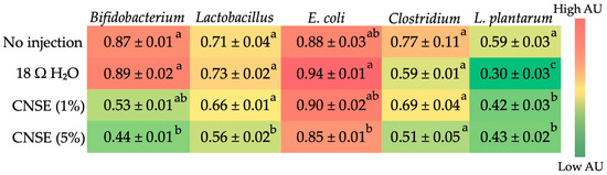 The microbial analysis indicated that the groups that received CNSE had decreased abundance of Bifidobacterium, Lactobacillus, and E. coli compared to the control groups. Further, there was no statistical difference between treatment groups for Clostridium spp. In the case of L. plantarum, there was a lower abundance in the intervention groups compared to the no-injection group and a greater abundance when compared to the H2O injection. Lactobacillus and Bifidobacterium are known as probiotics, whereas Clostridium is potentially pathogenic, and E. coli depending on the strain, can be either pathogenic or beneficial [49].