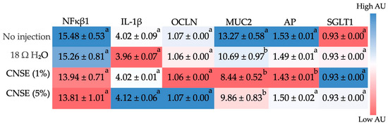 Heatmap of the difference between duodenal gene expression by intra-amniotic administration of injected CNSE in different concentrations (10 mg/mL; 50 mg/mL). Superscript alphabets (a,b) not indicated by the same letter in the same column means that there was a statistical difference between groups (p < 0.05) according to one-way ANOVA or Kruskal–Wallis, followed by post hoc tests. When there is a statistical difference between groups, the superscript alphabets (a,b) are represented in descending order of the values (the letter “a” represents the highest value). NFκβ1: nuclear factor kappa beta; IL-1β: interleukin 1 beta; OCLN: occludin; MUC2: mucin 2; AP: aminopeptidase; SGLT1: sodium-glucose cotransporter 1; CNSE: cashew nut soluble extract.