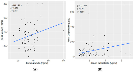 Linear regression (A) between fecal zonulin (ng/g) and serum zonulin (ng/mL); (B) between fecal calprotectin (µg/g) and serum calprotectin (µg/mL).