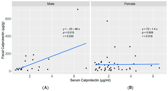 Linear regression between fecal calprotectin (µg/g) and serum calprotectin (µg/mL) (A) in males; (B) in females.