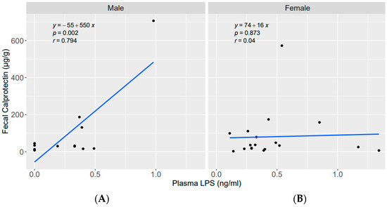 Linear regression between fecal calprotectin (µg/g) and plasma LPS (ng/mL). (A) in males; (B) in females.
