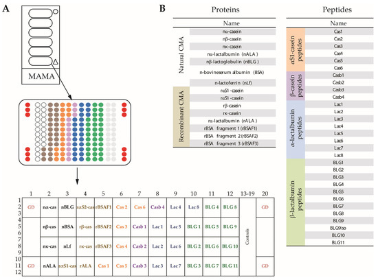 The layout and composition of the milk allergen micro-array (MAMA). (A) Glass slides containing six micro-arrays surrounded by an epoxy frame, magnification of one micro-array showing the order of dots (triplicates), and further magnification showing guide dots (GD), positions of cow’s milk (CM) allergens and peptides in boxes. (B) Lists of the natural CM allergens, recombinant CM allergens and CM-derived peptides according to Table S1.