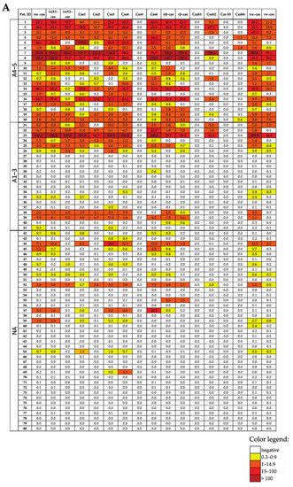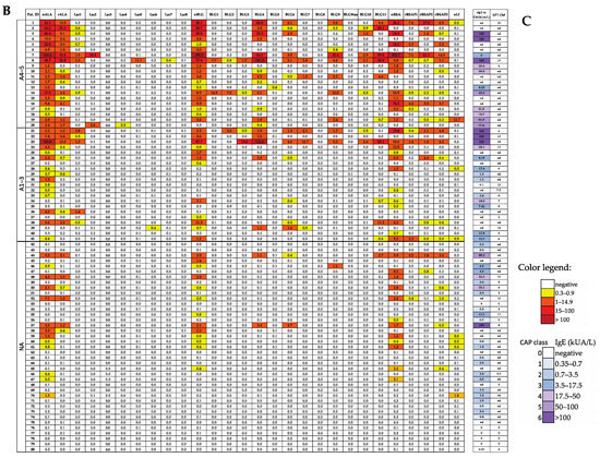Heat map of the IgE levels specific for caseins and casein-derived peptides (A), other milk allergen proteins and peptides thereof (B), and milk allergen extract-specific IgE levels and SPT results (C) in patients suffering from different intensities of CMA (A4–5, milk-related anaphylaxis with a Sampson grade of 4–5; A1–3, milk-related anaphylaxis with a Sampson grade of 1–3; and NA, without anaphylaxis). The IgE (ISU-E, kUA/L) levels are shown with a color code.