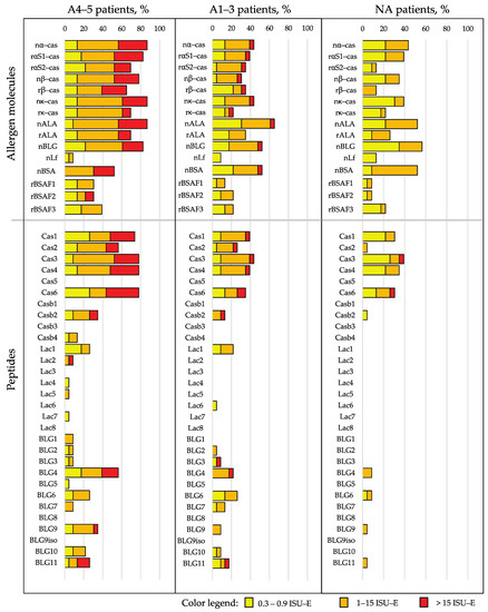Frequencies and intensities of IgE recognition (the percentages of reactive sera and IgE levels according to a color code) of milk allergen proteins and peptides in patients with anaphylaxis according to Sampson criteria of 4–5 (A4–5 patients), with anaphylaxis according to Sampson criteria of 1–3 (A1–3 patients) and without anaphylaxis (NA patients).
