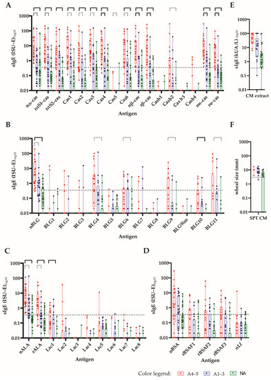The IgE levels of CM-allergic patients to micro-arrayed milk proteins and peptides. The specific IgE levels (y-axes: ISU-E or kUA/L log10, box and whisker diagrams showing the first and third quartiles, as well as the minima and maxima, i.e., whiskers) toward (A) caseins and casein-derived peptides (B); β-lactoglobulins and β-lactoglobulin-derived peptides (C); α-lactalbumin and α-lactalbumin-derived peptides (D); BSA recombinant BSA fragments and lactoferrin, (E) cow’s milk allergen extract and (F) SPT results (mean wheal diameters in mm) in patients with a Sampson grade of 4–5 (A4–5: red), a Sampson grade of 1–3 (A1–3: blue) and those without anaphylaxis (NA: green) are shown. Statistically significant differences between the groups are shown by a capped line as in the above, p-value << 0.001 (Holm-corrected to 0.000385; continuous bold line), p-value < 0.001 (continuous line) and p-value < 0.01 (dotted line).